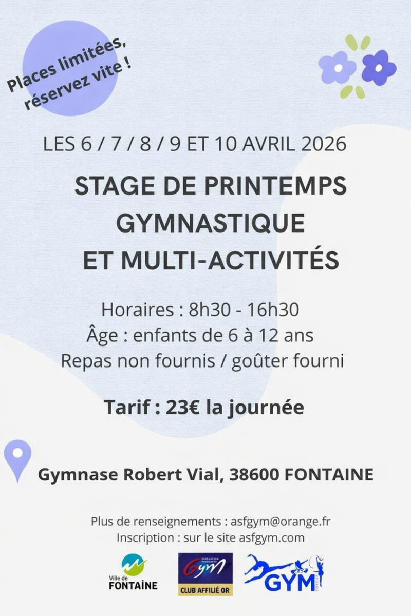 Le club ASF Gym Fontaine organise son stage de printemps pour les enfants de 6 à 12 ans !